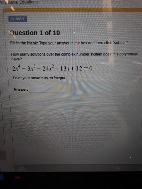 Correct answer to the question Question 8 of 10 How many solutions over the complex number system does this polynomial have. 2x4 3x3 24x2 13x 120 Enter your answer as an integer. How many errors can be corrected. 1 on a question Question 1 of 10 How many solutions over the complex number system does this polynomial have. The equation given is. Correct answer to the question Question 8 of 10 How many solutions over the complex number system does this polynomial have. 7x5 33x4 4x2 3x 52 0 Enter your answer as an integer. How would education from agricultural colleges assist farmers. Teach them basic reading and writing assist in technical skills provide.